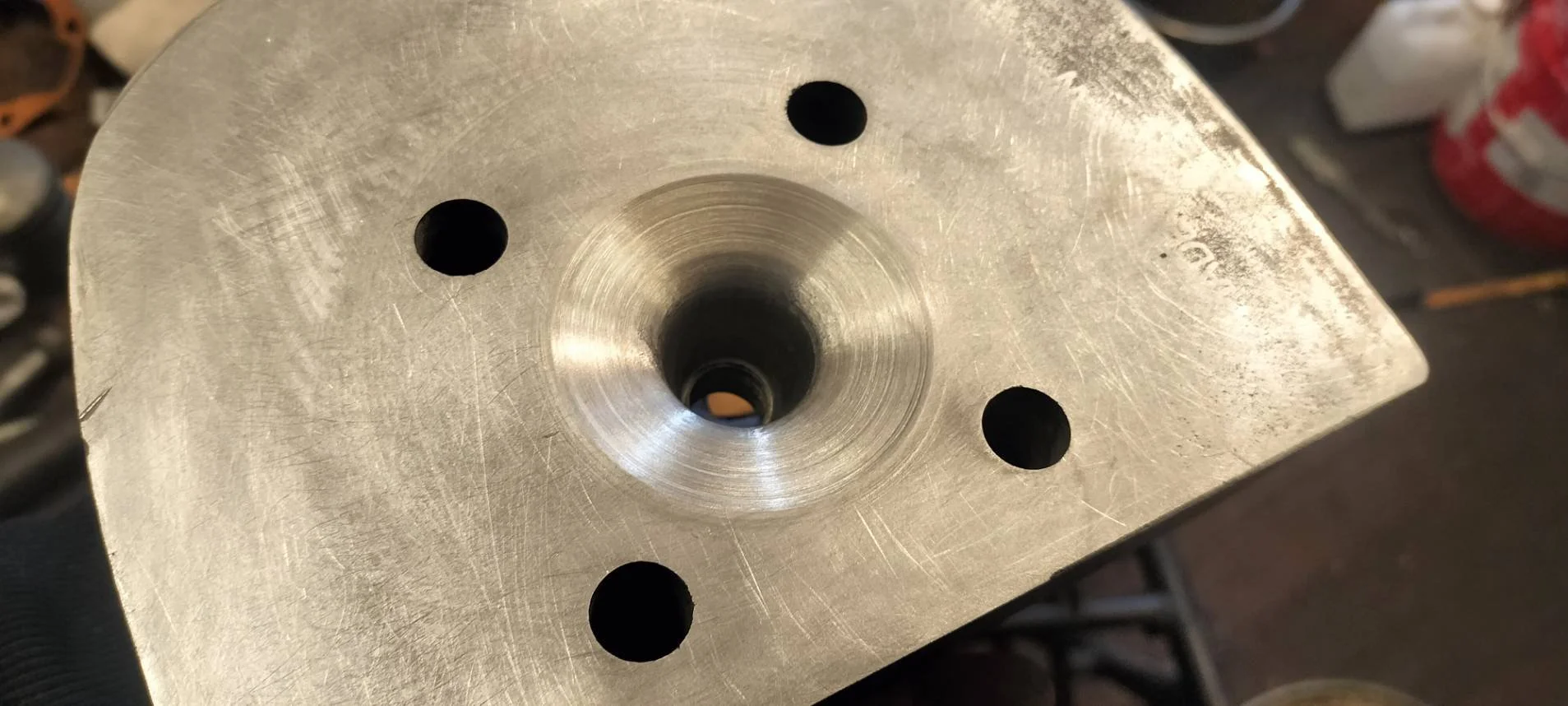 今月はシリンダーヘッドの切削。削ることでピストン上の空間を狭くして2次圧縮を上げるという作業。治具を製作して旋盤にくわえてあとはアルミなのでサクサクと削るだけ。